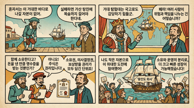주식회사 등장 이전의 세상에서 도전은 곧 ‘개인의 결단’이었습니다. 한 사람이 사업을 시작하고 그 결과에 대한 책임까지 온전히 혼자 지는 방식이었죠. 하지만 개인이 감당할 수 있는 자본에는 분명한 한계가 있고, 실패의 대가가 삶 전체의 파멸로 이어지는 구조에서는 누구도 과감한 도전을 선택하기 어렵습니다. 원거리 무역이나 대규모 인프라 건설처럼 막대한 자본과 높은 실패 가능성을 전제로 한 과제들은 개인이나 국가조차 단독으로 감당하기 벅찬 일이었죠.
