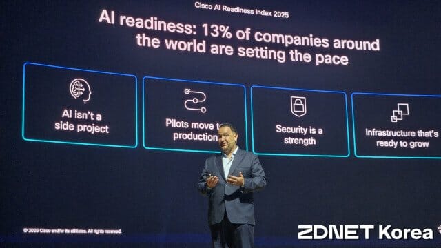 시스코는 AI 전환(AX)을 위한 준비가 전 세계적으로 아직 충분하지 않다고도 진단했다. 자체 조사 결과, 전체 기업 중 약 30%만이 AI를 본격적으로 활용 가능한 상태로 나타났다. 기술뿐 아니라 거버넌스·보안·인력 등 전반적인 준비가 필요하다는 설명이다.