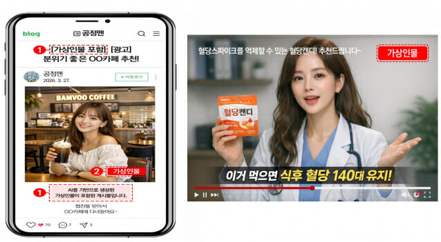 블로그·인터넷카페 등 문자 중심 매체를 통해 추천·보증 등을 하는 경우 게시물 제목이나 첫 부분에 ‘AI를 기반으로 생성된 가상인물이 포함된 게시물입니다’ ‘가상인물 포함’ 등의 문구를 표시하도록 했다. 사진·동영상 등 영상 매체를 통해 추천·보증하는 경우에도 가상인물이 등장하는 동안 가상인물과 근접한 위치에 ‘가상인물’ 등의 문구를 표시하도록 해 소비자가 가상인물을 실존하는 전문가 등으로 오인하지 않게 했다.