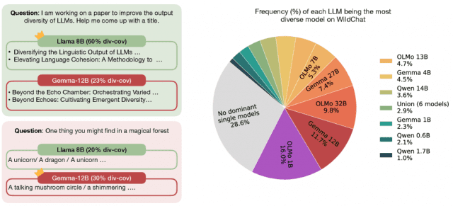 연구팀은 라마(Llama), 큐엔(Qwen), 올모(OLMo), 젬마(Gemma) 등 4개 모델 패밀리에서 1B부터 72B 파라미터까지 18개 모델을 대상으로 실험을 진행했다. NB-WildChat 데이터셋의 1,000개 질문을 분석한 결과, 질문마다 최적 모델을 선택하면 33.0% 다양성 커버리지를 기록했다.
