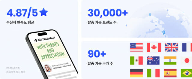 기프트로넛은 기업이 전 세계 어디로든 디지털 기프트카드를 발송할 수 있도록 지원하는 글로벌 플랫폼이다. 현재 91개국에서 사용 가능한 3만 종 이상의 기프트카드 상품을 제공하며, 국가 간 대량 발송이 가능한 인프라를 구축하고 있다.