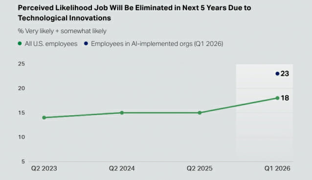 AI에 대한 기대와 함께 불안도 커지고 있다. 2026년 1분기 갤럽 조사에 따르면, 미국 직원의 18%가 향후 5년 내 자신의 일자리가 AI나 자동화 같은 기술 혁신으로 사라질 가능성이 "매우" 또는 "다소" 높다고 응답했다. 이 수치가 실질적으로 의미하는 바는, 미국 전체 직장인 약 5명 중 1명이 이미 자신의 일자리에 대한 불안을 품고 매일 출근하고 있다는 것이다.