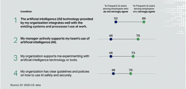 갤럽이 2026년 1분기 미국 직원들을 대상으로 조사한 결과, 조직 내에서 AI를 자주 사용하게 만드는 가장 강력한 두 가지 요인은 기존 시스템과의 기술적 통합, 그리고 관리자 주도의 AI 채택이었다.
