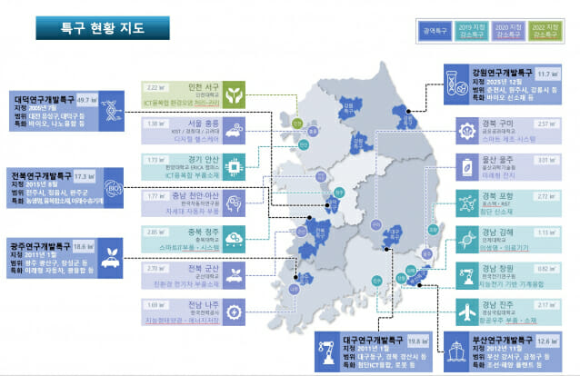 연구개발특구는 현재 대덕을 비롯한 광주, 대구, 부산, 전북, 강원 등 6개가 조성돼 있다. 또 안산, 김해, 진주, 창원, 포항, 청주, 울주, 천안‧아산, 군산, 구미, 서울(홍릉), 나주, 인천(서구) 등에 13개 강소특구가 지정돼 운영 중이다.