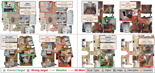 그림 6. 물체·이미지·설명·질문 4가지 목표 유형에서 기존 AI(빨간선)의 헛돌기와 MetaNav(초록선)의 직선 경로 비교