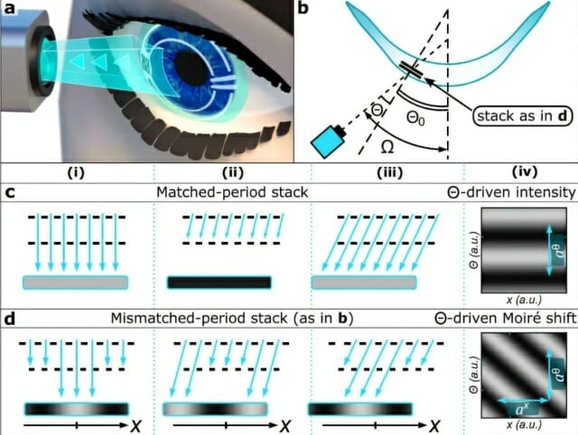 각 렌즈에는 두 개의 초박형 광학 격자가 미세한 간격을 두고 배치되어 있다. 눈이 움직이면 이 층들이 서로 어긋나며 ‘모아레 패턴’을 형성하고, 카메라는 이 패턴을 감지해 시선의 방향을 해석한다.
