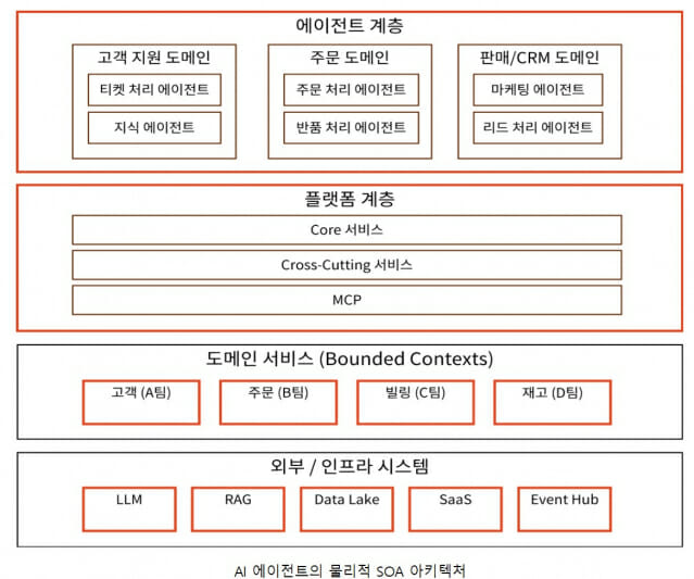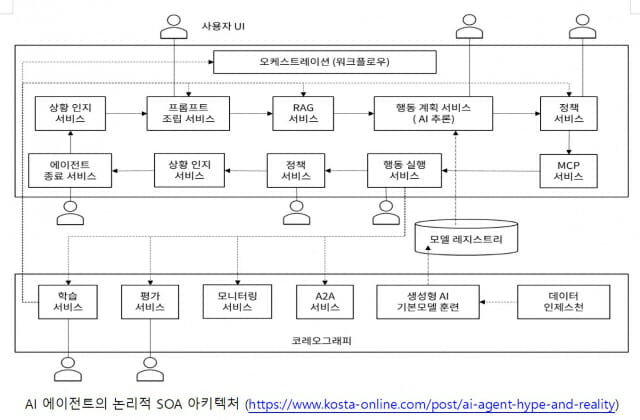 아래 그림은 SOA 스타일로 구성된 AI 에이전트의 논리적 아키텍처를 보여주며, 각 블록은 기능적으로 분리된 논리적 서비스(또는 컴포넌트)로 이해할 수 있다. 이러한 구조에서 에이전트는 여러 서비스를 동적으로 조합하고 오케스트레이션하는 역할을 수행한다. (박준성, AI Agent의 허허 실실, KOSTA Online, 2026: https://www.kosta-online.com/post/ai-agent-hype-and-reality)