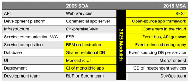 아래 표는 2005년경 확산되기 시작한 웹 서비스 기반의 SOA, 2015년경 확산되기 시작한 MSA, 그리고 2025년 확산되기 시작한 Modulith가 적용하는 아키텍처 패턴들을 비교, 보여주고 있다. 표에서 노란색 부분이 Modulith 적용 패턴들이다.
