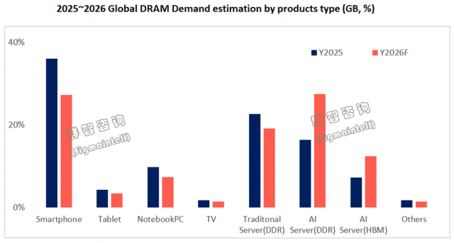 올해 가전·IT 제품용 D램 수요는 전년비 감소가 예상됐다. 전체 D램 비트 소비량 내 비중은 2025년 54%에서 2026년 42%로 하락할 것으로 전망됐다. D램 수요 감소는 보급형 PC, 저가 스마트폰, 사물인터넷(IoT) 기기 등에서 두드러질 수 있다.