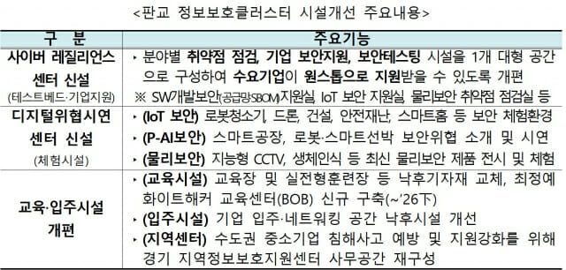판교 정보보호클러스터는 2017년 개소한 이래 보안스타트업 육성 및 수도권 보안 인재 양성의 거점으로 자리매김해왔지만, 시설 노후화로 활용도가 떨어지는 문제가 있었다. 이에 과기정통부는 산업계 수요 및 전문가 의견을 반영해 약 1년 간 기업 정보보호 통합지원 및 체험시설, 입주 및 교육시설 등을 개선했다.