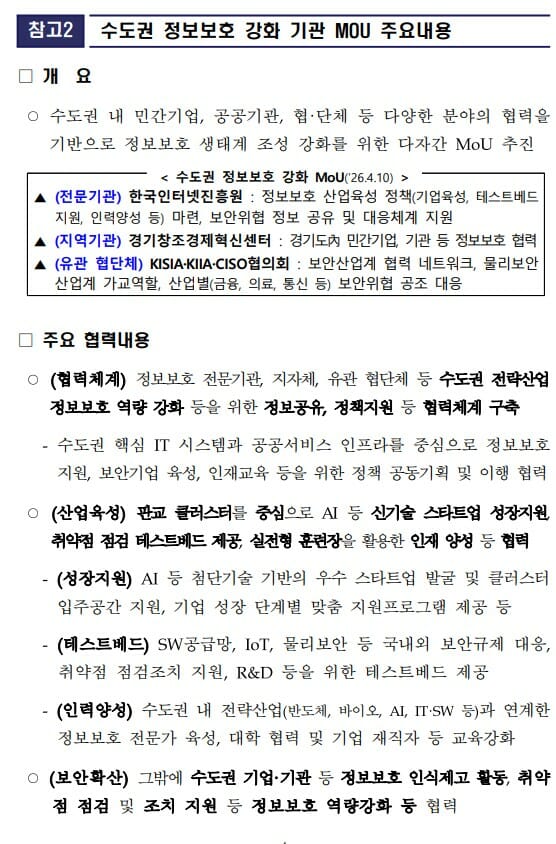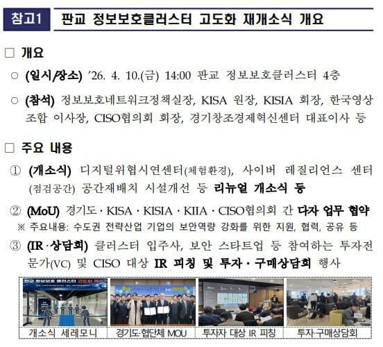 또 이번 판교 클러스터 재개소를 계기로 KISA, KISIA, 한국CISO협의회, 한국영상정보연구조합, 경기창조경제혁신센터 등 주요 정보보호 유관기관 및 협·단체가 모여 이날 MOU를 맺고 경기권 전략산업의 보안역량 강화를 위한 긴밀한 협력을 다짐하는 한편 클러스터 입주사를 비롯한 다수의 보안 스타트업이 참여하는 투자전문가 및 CISO 대상 IR 피칭, 투자‧네트워킹 행사를 개최, 80여명이 참석하는 등 정보보호산업계의 성장과 투자확대도 함께 유도했다고 과기정통부는 밝혔다.