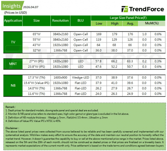 시장조사업체 트렌드포스는 최근 4월 TV와 모니터, 노트북용 LCD 가격이 전월과 대체로 비슷하겠지만, 패널 업체들이 향후 나타날 수 있는 위험을 피하기 위해 가격 인상을 검토 중이라고 밝혔다.