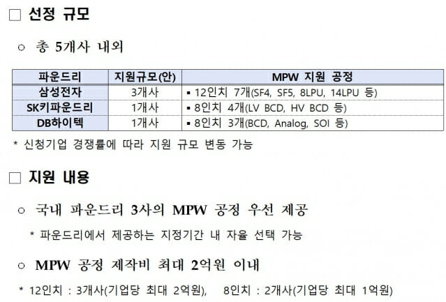 공고에 따라 국내 파운드리 3개사의 MPW 공정 이용을 희망하는 창업 10년 이내의 유망 팹리스 스타트업을 모집해 서류와 발표 평가를 통해 최종 5개의 스타트업을 선정한다. 특히 이번에는 그간 팹리스 스타트업의 수요가 많았던 12인치 공정의 지원 규모를 확대해 12인치 공정(삼성전자) 3개사, 8인치 공정 2개사(SK키파운드리, DB하이텍)를 지원한다. 12인치 3개사는 기업당 최대 2억원, 8인치는 2개사를 기업당 최대 1억원을 지원한다.