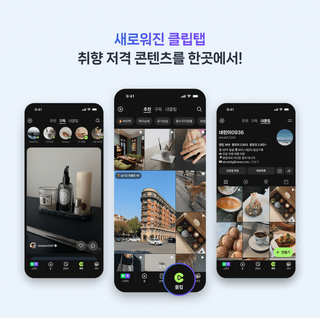 아울러, 클립은 이용자들이 트렌디하고 관심사에 맞는 콘텐츠를 탐색할 수 있도록 클립탭 구성도 개편한다. 기존 ▲구독 ▲추천 ▲인기 ▲스팟 탭에서 ▲추천 ▲구독 ▲내클립으로 구성된 3탭 구조로 개편해 이용자들이 원하는 콘텐츠를 직관적으로 만나볼 수 있도록 지원한다.
