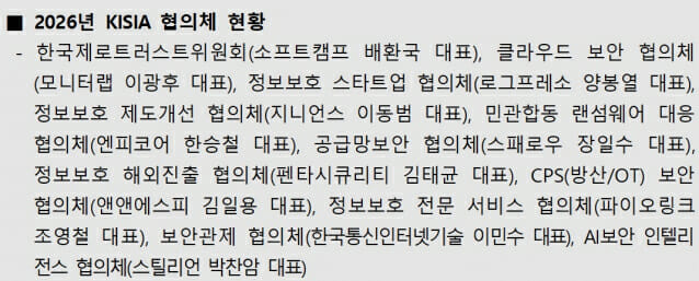 전문성 강화를 위해 기존 ‘정보보호 서비스 전문위원회’를 ‘정보보호 전문 서비스’와 ‘보안관제’ 협의체로 분할, 적정 대가 산정 등 현안 대응에 집중한다. 또 ‘AI보안 협의체’는 ‘AI보안 인텔리전스 협의체’로 '자율보안협의체'는 '공급망보안협의체'로 각각 개편, 민간 위협 정보 공유 허브 역할을 강화했다. 이와함게 기존 협회 사무국 주도로 운영하던 협의체 체계를 각 협의체별 의장과 소속 기업 간사 중심으로 전환했다. 해외진출협의체 의장은 기존 김민수 엘에스웨어 대표 대신 김태균 펜타시큐리티 대표가 새로 맡았다.