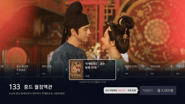 전용관에선 기존 VOD 서비스에서 접하기 어려웠던 ‘아시아엔(AsiaN)’ 콘텐츠를 포함해 차별화된 중국 드라마 콘텐츠를 선보인다. ‘태평년’, ‘수룡음’, ‘헌어’ 등 최신 인기작을 비롯해 다양한 장르의 프리미엄 콘텐츠를 부가세 별도 월 5000원으로 무제한 감상할 수 있다.