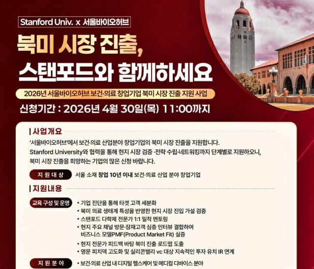 서울바이오허브 관계자는 “기술력은 있지만 FDA 인허가, 보험 급여 등 미국 의료 시장의 복잡한 구조 앞에서 막막함을 느끼는 스타트업들이 많다”며 “이번 사업이 스탠포드 현지 네트워크를 기반으로 북미 시장 진입의 실질적인 첫발을 내딛는 기회를 제공하길 바란다”고 말했다.