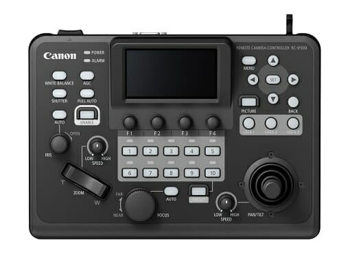 리모트 카메라 컨트롤러 'RC-IP300'은 3.5인치 터치패널과 대형 조이스틱, 아이리스 노브로 실시간 영상 확인과 팬, 틸트, 줌, 노출을 조절한다.