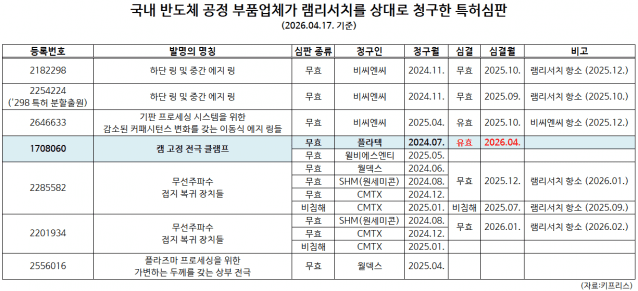 17일 업계에 따르면 특허심판원은 지난 15일 플라텍이 램리서치의 '캠 고정 전극 클램프' 특허(등록번호 1708060)를 상대로 청구한 무효심판에서 플라텍 주장을 기각했다. 플라텍은 지난 2024년 무효심판을 청구하며 해당 특허의 청구항(권리범위)은 모두 무효라고 주장했지만 특허심판원이 받아들이지 않았다.