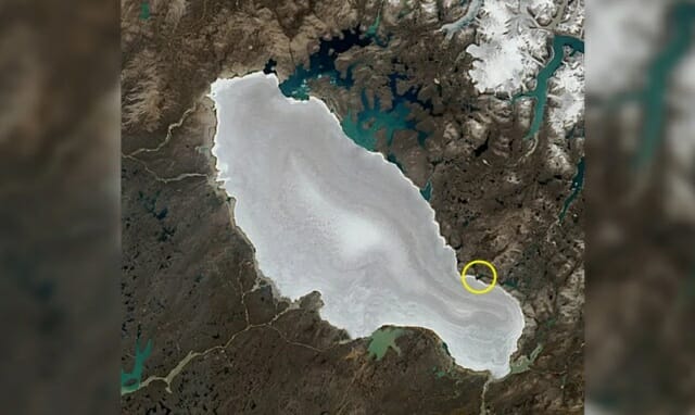 작은 호수가 거대한 고대 빙하의 눈 덮인 가장자리를 가로지르는 이색적인 풍경이 위성에 포착돼 주목받고 있다. 이 장면은 기후 변화로 빙하가 사라질 가능성과 맞물려 더욱 관심을 끌고 있다.