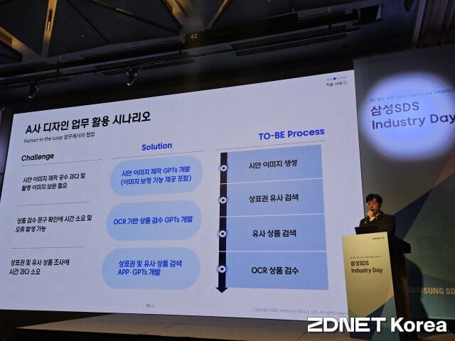 삼성SDS는 다수 생활용품을 취급하는 리테일 플랫폼 기업 A사 디자인 업무에 맞춤형 챗봇 서비스 'GPTs' 4종을 개발 및 적용했다. A사는 취급 상품이 많아 디자인 이미지 제작 공수가 크고 담당자에 따른 품질 편차도 상당했다. 패키지 검수와 상표권 조사도 수작업에 의존해 오류 가능성과 시간 소요가 컸다.