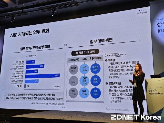 이아나 삼성SDS MSP 사업팀 컨설턴트는 17일 서울 강남구 웨스틴 파르나스에서 열린 '삼성SDS 인더스트리 데이'에서 "AI 혁신이 성공하려면 C레벨과 현장이 같은 언어로 이야기하고 공감대를 형성하는 것이 핵심"이라며 렌탈 서비스 기업의 정비 지원 시스템 구축 사례를 공개했다.