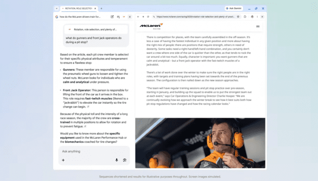예를 들어 사용자가 하이킹 코스를 찾기 위해 여러 사이트를 열어둔 상태라면 이 탭들을 한 번에 선택해 비슷한 코스를 다른 지역에서 추천해 달라고 요청할 수 있다. 기존에는 각 정보를 따로 비교해야 했지만 이제는 AI가 이를 종합해 제안한다.