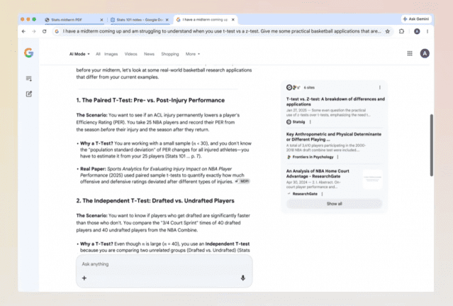 사용자는 강의 등을 학습할 때도 해당 기능을 이용할 수 있다. 수업 노트나 강의 슬라이드, 논문을 여러 탭으로 열어둔 상태에서 특정 개념을 이해하기 어려울 경우 이를 모두 포함해 설명을 요청하면 보다 맞춤형 답변을 받는 식이다.