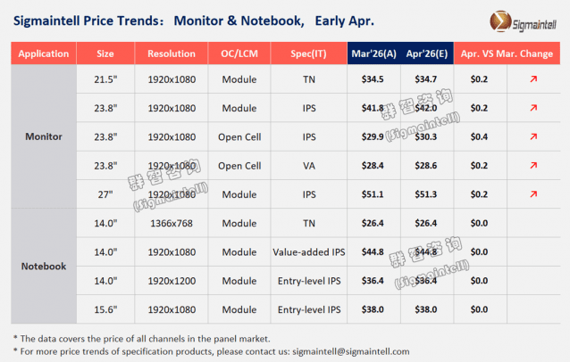 시그마인텔이 제시한 여러 크기 모니터 패널 중 23.8인치 해상도 FHD(1920x1080) 오픈셀 방식 IPS 패널 가격은 3월 29.9달러에서 4월 30.3달러로 0.4달러 오를 것으로 예상됐다.