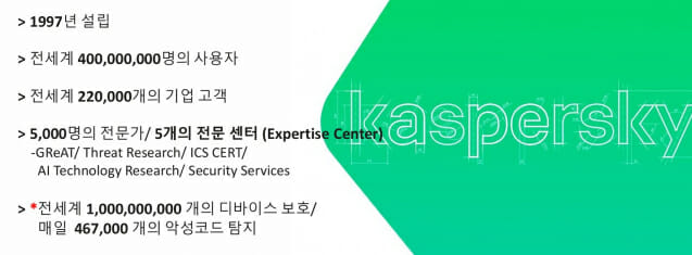 처음에는 백신(안티바이러스)으로 시작했다. 다양한 솔루션을 내놓으며 종합보안기업으로 자리매김했다. 세계 사용자는 4억명에 달한다. 이 중 정보공유에 동의한 사용자 1억2000명에게서 공격자 정보를 제공받아 분석한다. 이 부분이 29년 역사의 카스퍼스키가 보유한 '진정한 힘'이다. 이 회사가 "세계에서 해커 정보를 가장 많이 갖고 있다"고 말하는 이유이기도 하다.