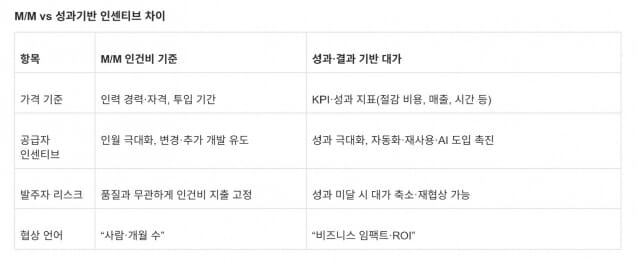 이 구조를 도입하면 발주자는 성과 검증이 가능해지고, 공급자는 성취에 따른 실질 보상을 기대할 수 있다. AI 및 자동화 활용 기업이 더 높은 수익을 얻을 수 있어 시장의 효율성도 개선된다.