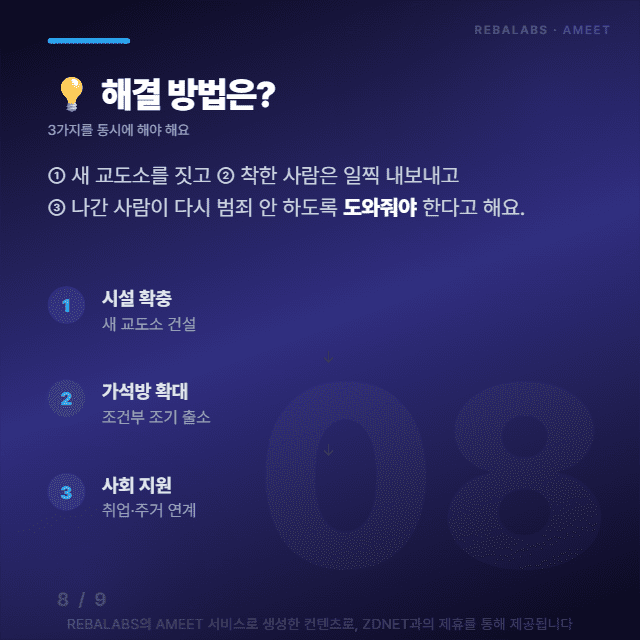 전문가들은 이 문제를 해결하려면 새로운 교도소 시설을 짓고, 모범 수용자에 대한 가석방을 확대하며, 출소자가 사회에 안정적으로 복귀할 수 있도록 지원하는 세 가지를 동시에 추진해야 한다고 강조하고 있어요.