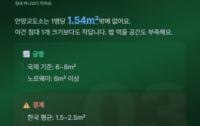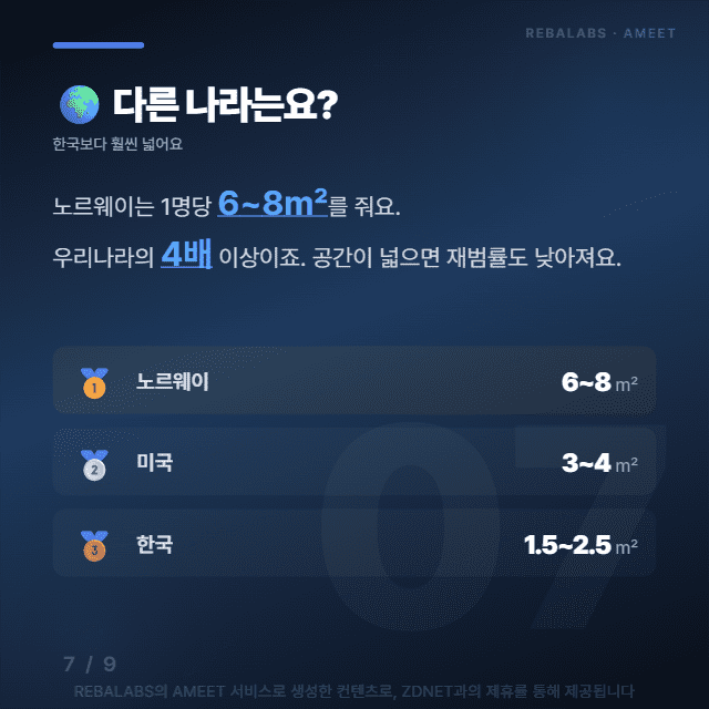 반면 노르웨이 같은 나라는 수용자 1명당 6~8㎡의 공간을 보장하는데, 이건 우리나라의 4배가 넘는 수준이에요. 그만큼 재범률도 낮게 유지되고 있고요.