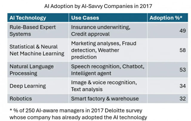 2017년 가트너의 약 3100명의 CIO를 대상으로 한 설문조사에 따르면, 당시 AI를 실제로 운영 환경에 도입한 기업은 약 4%에 불과했다. 한편 같은 해 딜로이트(Deloitte)가 AI를 이미 도입한 기업의 종사자들을 대상으로 실시한 조사에 따르면, 이들 기업에서 Rule-Based Expert system(약 49%), 통계 및 Neural Network 기반의 기계 학습(약 58%), 자연어 처리(약 53%), Deep Learning(약 34%) 등 다양한 AI 모델들을 병행해 활용하고 있었다. (아래 표 참조)