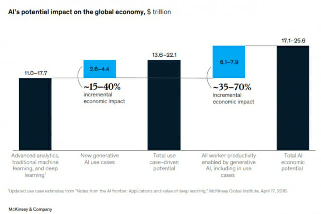 맥킨지에 의하면, 아래 도표에서 보듯이, AI는 전반적으로 연 17~26조 달러의 경제적 효과를 창출할 수 있으며, 이 중 생성형 AI는 약 6~8조 달러의 기여를 할 것으로 추정된다. (McKinsey, The economic potential of generative AI: The next productivity frontier, 2023). 생성형 AI의 기여 중 AI 에이전트가 차지하는 비중에 대해서는 아직 공식적으로 제시된 바가 없다.