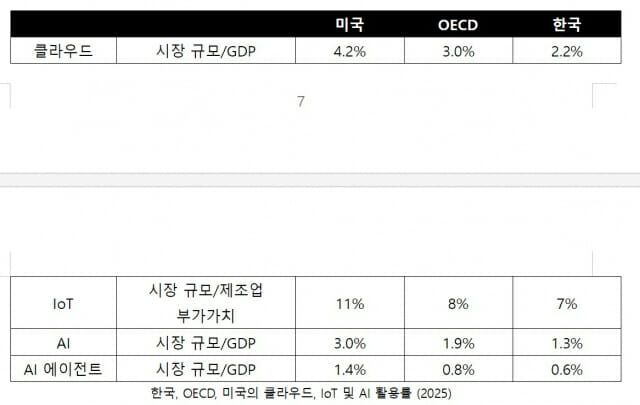 예를 들어 클라우드의 경우, 상용 애플리케이션, 플랫폼, SI 용역 및 자체 개발을 포함한 시장 규모를 GDP로 나눈 지표 기준으로 약 2.2% 수준으로 추정되며, 이는 OECD 평균 약 3.0%, 미국 약 4.2%에 비해 낮다. IoT의 경우에는 제조업 중심 기술 특성을 반영해 시장 규모를 제조업 부가가치로 나눈 지표를 적용하면 약 7% 수준으로, OECD 평균 8%, 미국 11%보다 낮은 것으로 추정된다.
