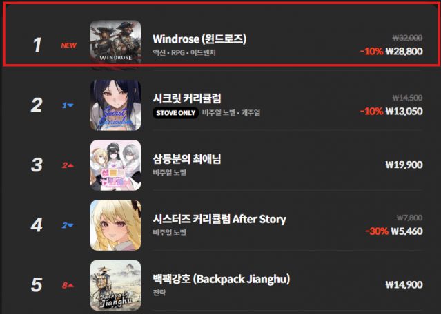 '윈드로즈'는 스마일게이트 스토브 플랫폼에도 입점하며 흥행세를 이어가고 있다. 실제로 윈드로즈는 단숨에 스토브 주간 매출 및 플레이타임 순위 1위에 등극하며 플랫폼 내 트래픽을 견인 중이다.