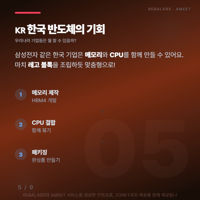 삼성전자 같은 한국 기업들은 메모리와 CPU를 함께 만들 수 있는데, 이게 레고 블록을 조립하듯 고객 맞춤형으로 솔루션을 제공할 수 있다는 뜻이에요. 단순히 부품만 파는 게 아니라 맞춤형 통합 솔루션으로 승부를 걸 수 있는 거죠.