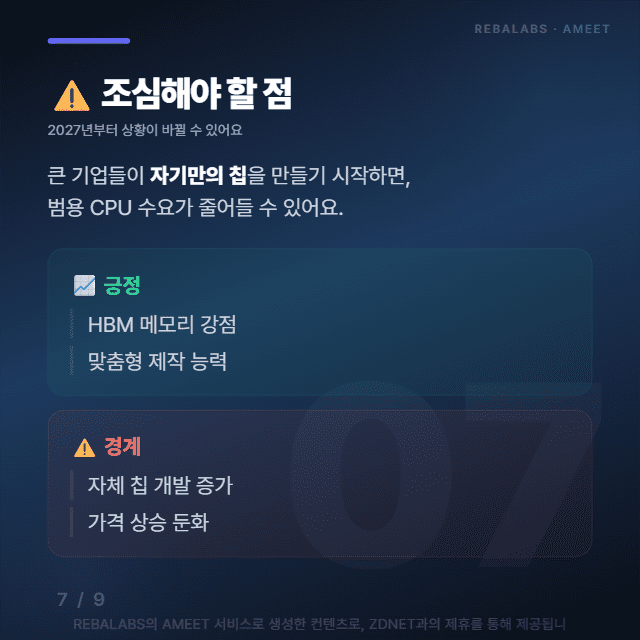 다만 2027년부터는 큰 기업들이 자체 칩을 만들기 시작하면서 상황이 바뀔 수 있어서, 그 전에 빠르게 체제 전환을 마쳐야 한다고 하네요.
