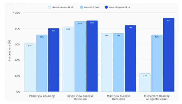 가장 극적인 변화는 산업 현장의 계기 판독 정확도에서 나타났다. 제미나이 로보틱스 ER 1.5는 계기 판독 성공률이 23%에 그쳤으나, ER 1.6은 86%로 뛰었고 에이전틱 비전(agentic vision)을 적용하면 93%까지 올라간다.
