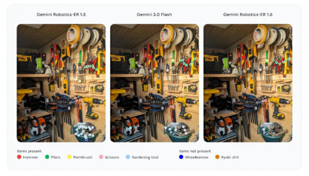 성공률 도약의 밑바탕에는 포인팅(pointing)과 성공 감지(success detection) 기능의 고도화가 있다. 포인팅이란 모델이 이미지 속 특정 지점을 좌표로 가리키는 능력으로, 물체 개수를 세거나 이동할 위치를 지정하거나 최적의 잡기 지점(grasp point)을 찾는 데 쓰인다. 제미나이 로보틱스 ER 1.6은 이미지 속 망치 2개, 가위 1개, 붓 1개, 펜치 6개를 정확히 식별하고, 존재하지 않는 외바퀴 손수레와 료비(Ryobi) 드릴은 가리키지 않는 반면, 이전 모델인 ER 1.5는 망치와 붓 개수를 틀리고 가위를 놓쳤으며 외바퀴 손수레를 환각으로 만들어냈다. '있는 것과 없는 것'을 구분하는 능력은 로봇이 잘못된 행동을 하지 않도록 막는 첫 관문이다.