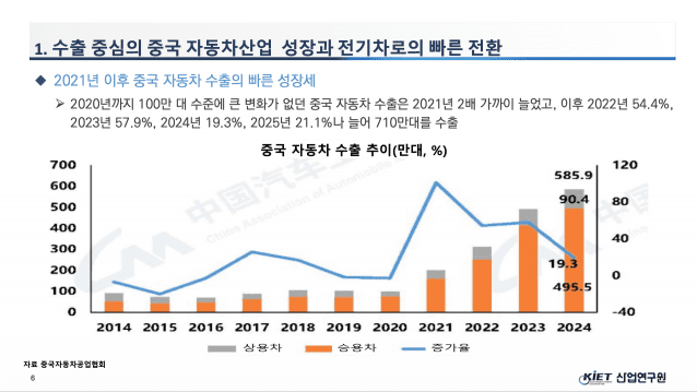 조 연구위원은 최근 각국이 자동차 산업 정책을 강화하는 배경에도 중국 변수의 영향이 크다고 설명했다. 특히 중국 자동차 산업이 내수 중심에서 수출 중심 구조로 빠르게 전환되고 있는 점을 핵심 변화로 지목했다.