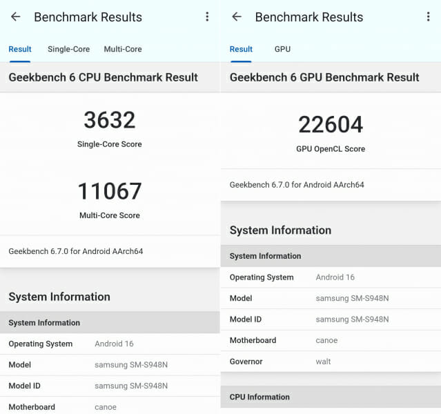 칩셋의 성능을 가늠해볼 수 있는 긱벤치6 테스트 결과는 싱글코어 3632점, 멀티코어 1만1067점으로 나타났다. GPU는 2만2604점이다. 갤럭시S25 울트라(싱글코어는 2852점, 멀티코어 9433점) 대비 큰 폭의 향상이 있던 것으로 분석된다.
