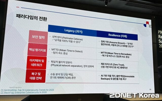 손 교수는 "완벽한 방어는 불가능함을 인정하고 침해를 가정한 '신속한 복구 및 오프라인 백업'에 예산을 우선 배정해야 한다"며 "망분리 완화 및 클라우드 환경에서 네트워크 경계는 소멸됐다. 실시간 리스크 기반의 신원을 새로운 방화벽으로 설정해야 한다"고 강조했다.