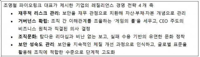 조영철 파이오링크 대표는 ‘레질리언스, 경영의 미래’ 주제로 발표했다. 단순히 보안 방어를 넘어 위기 속에서도 사업을 지속하는 ‘복원력’이야 말로 기업의 생존과 성장을 위한 경영의 핵심이 됐다고 강조했다.