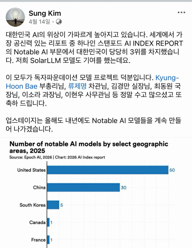 이 과정에서 일부 매체 기사와 기업 측 메시지가 동시에 시장 해석에 영향을 미쳤다는 평가가 나온다. 특히 공식 명단이 공개되지 않은 상황에서 특정 기업 모델이 포함된 것처럼 읽히는 신호가 잇따르면서 혼선이 커졌다는 지적이다. 당시 김성훈 업스테이지 대표는 자신의 페이스북에 "대한민국이 당당히 3위를 차지했다"며 "저희 솔라(Solar)LLM 모델도 기여를 했다"고 밝힌 바 있다.