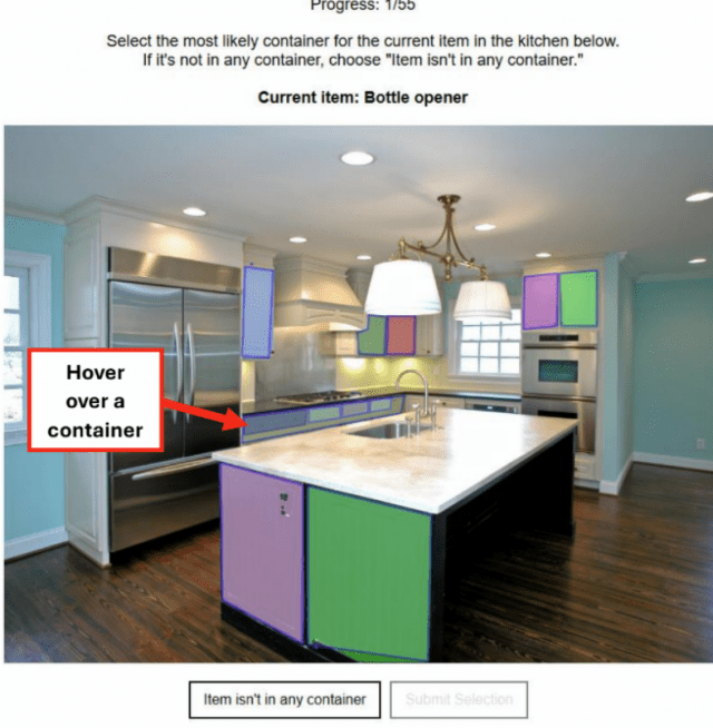 시험지 자체가 얼마나 공들여 만들어졌는지도 볼만하다. 연구진은 먼저 공개 주방 사진 데이터셋인 선(SUN)에서 사진을 뽑아 업워크(Upwork)에서 모집한 주석자 세 명에게 "도마 넣는다면 어디?", "행주 넣는다면 어디?"를 묻고 답을 받게 했다.