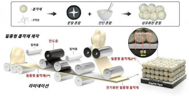 배터리 전극 제조에 사용되는 ‘건식 공정’을 DAC에 적용한 것. 액체를 쓰지 않고 분말을 그대로 눌러 단단한 필름으로 만드는 방식이다. 이는 탄소를 흡수하는 물질을 빈틈없이 촘촘하게 채울 수 있어, 더 많은 이산화탄소를 한 번에 붙잡을 수 있게 해준다.