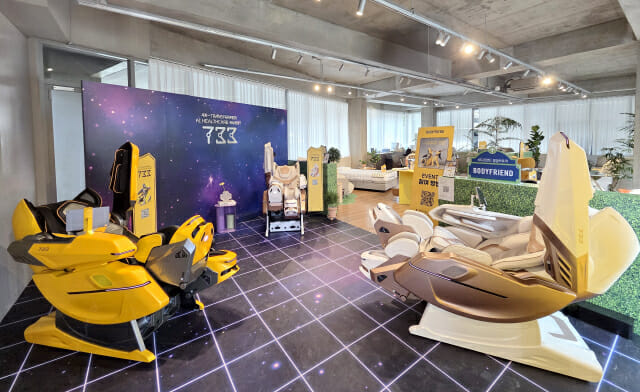이 곳에는 지난 달 출시한 웨어러블 AI헬스케어로봇 ‘733’과 퀀텀AI, 의료기기 메디컬파라오·메디컬팬텀로봇, 콤팩트 헬스케어로봇 팔콘S, 마사지소파 파밀레S·파밀레C, 라클라우드 헬스모션, W정수기 등이 거실과 침실 등으로 조성된 공간에 자연스럽게 배치되어 체험객들을 맞는다. 여기에 소형 마사지기 브랜드인 ‘바디프랜드 미니’ 존도 별도로 마련되어 베스트 셀러인 마사지건, 두피올케어, 종아리 마사지기 등도 경험해 볼 수 있다.