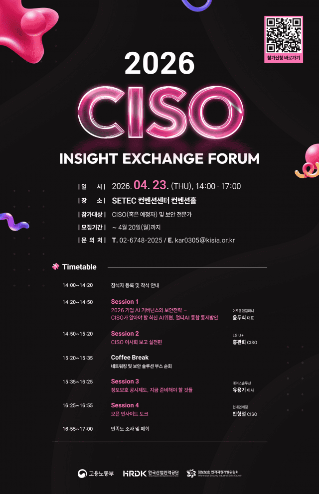 한국정보보호산업협회(KISIA) 정보보호인적자원개발위원회(정보보호 ISC)는 지난 23일 SETEC 컨벤션홀에서 '2026 CISO(정보보호 최고 책임자) 인사이트 익스체인지 포럼'을 성황리에 개최했다고 24일 밝혔다.